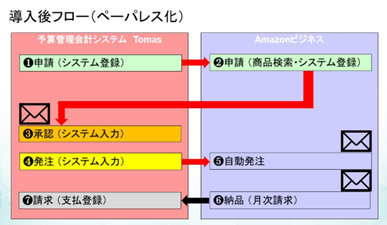 新たな業務フローでは、Amazonビジネス上で商品を選定すると、その情報が自動的に予算管理会計システムへ登録されます。