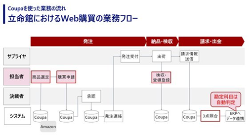 購買プラットフォームには、Coupaを採用。発注・納品・請求の3つの情報を照合することで出金依頼処理を発生させる「3点照合方式」で運用することとしました。購買パターンは、大きく3つ。物品、役務サービスなどの「見積・発注起点」、Amazonビジネスなどの「Web購買」、公共料金などの「請求所起点」で、それぞれに最適なやり方で処理できるようにしています。取引頻度の高い大学生協店舗とは、日次で電子インボイスを連携し、電子請求書を発生させることで対応します。